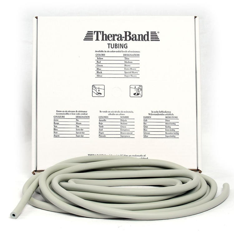 Thera-band Tubing Level Super Hård Træningselastik Sølv 30,5m er et uundgåeligt redskab til effektiv træning. Denne elastik er ideel til både sportsterapi og genoptræning.
